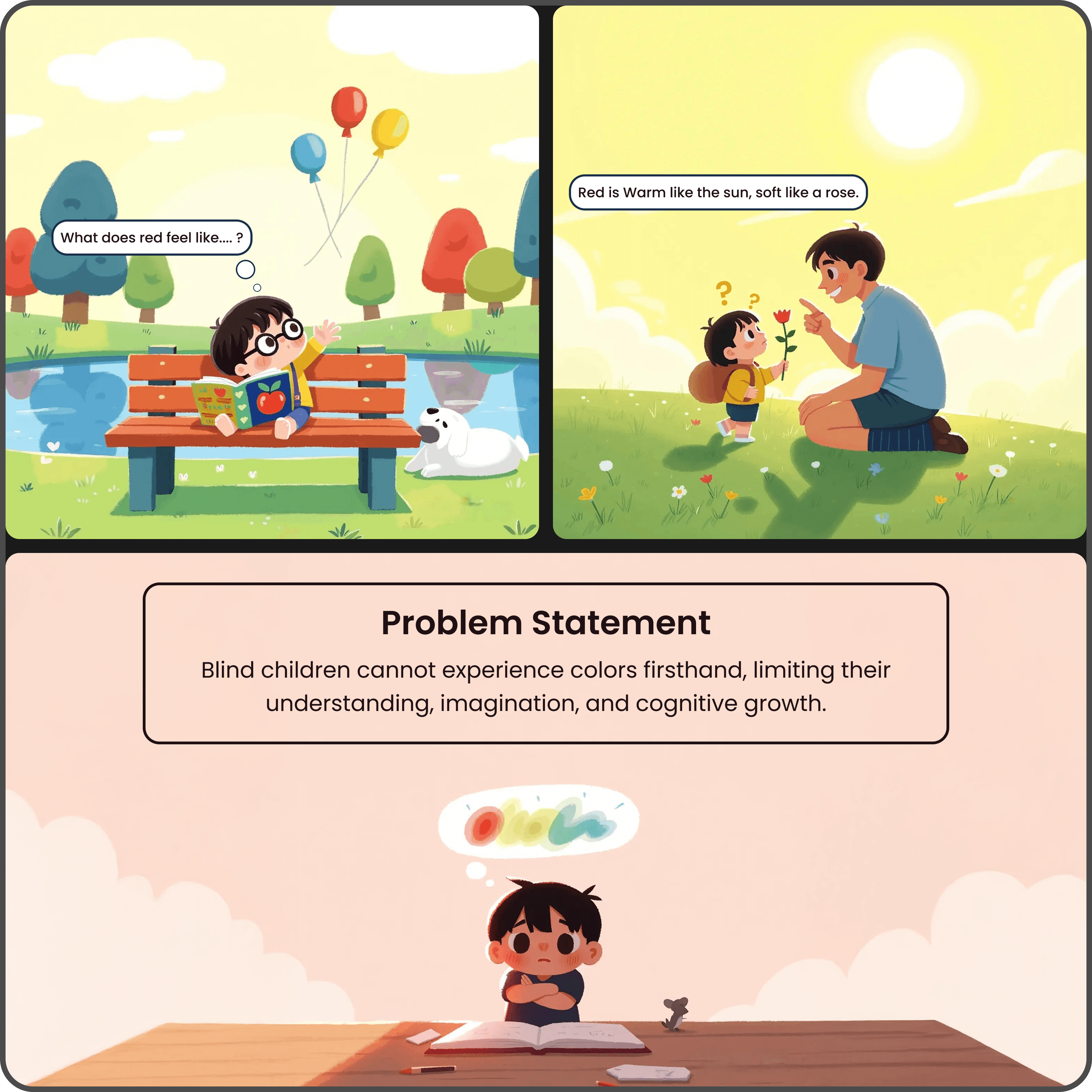 Feel The Hues is an interactive book that translates the abstract concept of color into a tangible multisensory experience. By combining touch, smell, and sound, the book helps visually impaired children “feel” color, enhancing both their learning and emotional development.