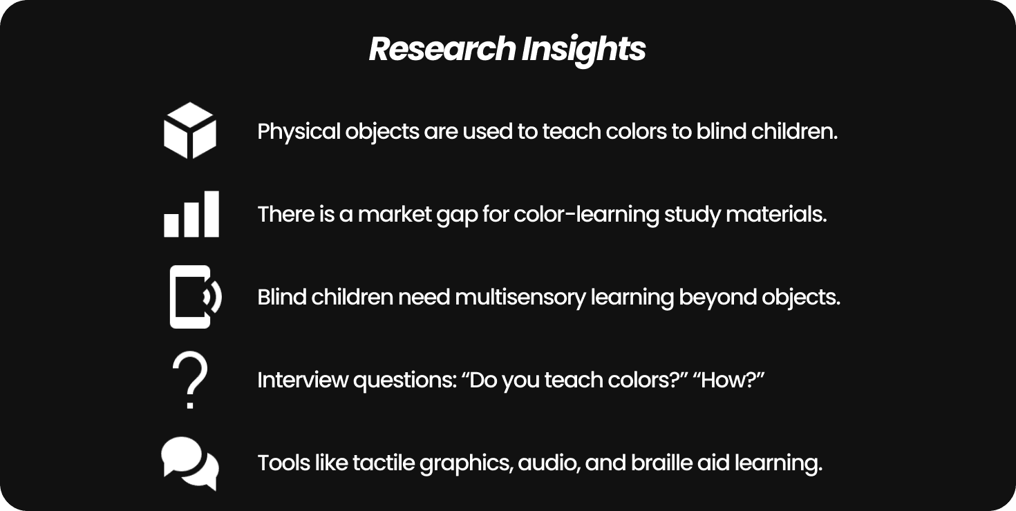 Analyzed existing assistive technologies (tactile graphics, audio descriptions, braille displays) and identified a market gap for comprehensive color education materials.
